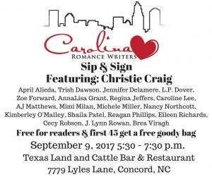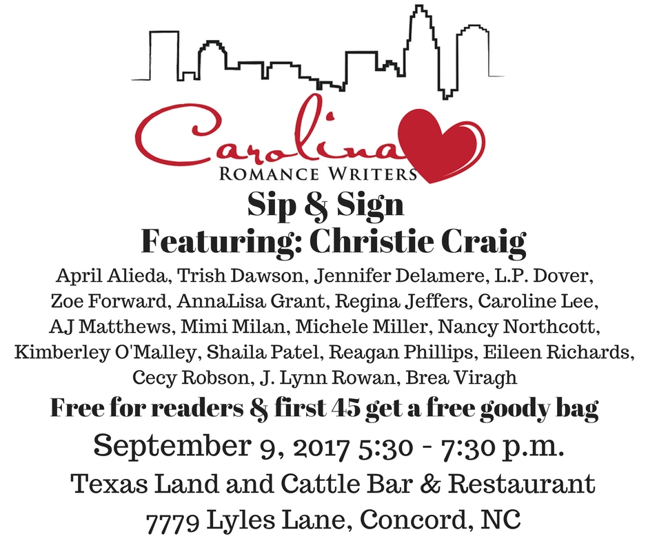 Get ready for an evening of fun! The Carolina Romance Writers Sip & Sign event is a multi-author book signing bringing romance authors and readers together for a couple of hours of fun over good food and beverages. Free to attend, and first 45 attendees will receive a free goody bag! I’ll have copies of The Captain’s Daughter, as well as books from the Love’s Grace trilogy. I would love to see you there!