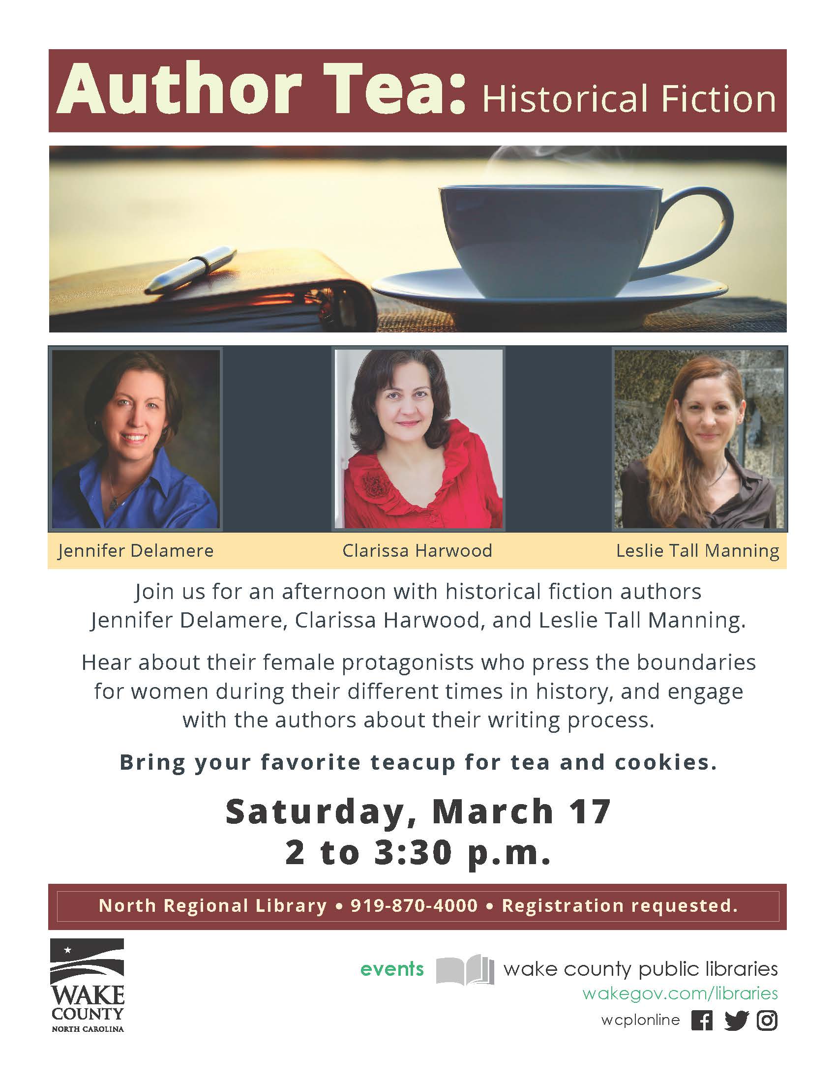 I’m happy to announce this upcoming event on March 17 at 2 pm at the Wake County North Regional Library in Raleigh, NC: an author tea! Bring your favorite tea cup — there will be tea and cookies and great conversation.
